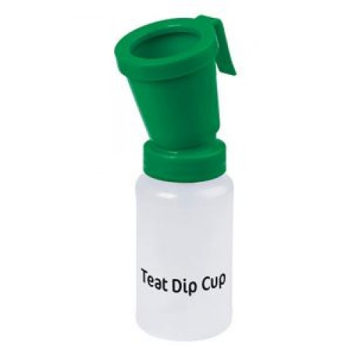 Are rezervor gradat, cu carlig practic pentru curea, disponibil in doua culori, pentru dezinfectie inainte si dupa mulgere.